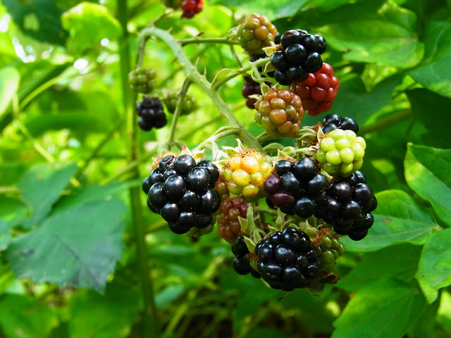 金曜日の夕方、「またブラックベリーが熟してるかな?」と見回りに行ってきました。このあいだ一度「収穫」しに行ってきて、まだまだ赤い「後輩」たちがいっぱいあったので、待ち構えているというわけです。なんだか、こういう目的のため散歩に行くのは「動機が不純」かしらね? ^^;