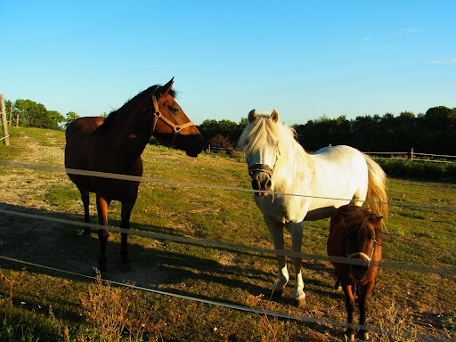 春のお花見のときのサクランボ並木の近くのお馬さんたち。このごろ仲間が増えて、ちびっこがいます。子どもなのか、小型の馬なのか・・・ 西陽に照らされて気持ち良さそう。