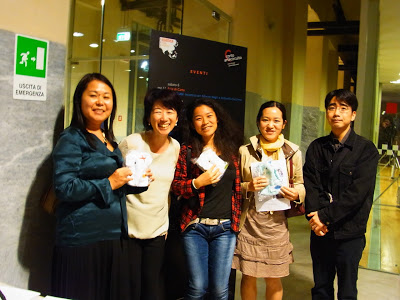 上映後の質疑応答では、2009年にやはり震災を被災したラクイラから来た方が発言されました。同じ現実を見た人どうしの連帯。そして最後に 「実は映画の中にも出てくる神戸の震災でフィアンセを亡くしたけれど、いまはオーストリアに住んでいて、支援のため映画にも出て来るまけないぞうを応援しています」と我謝さんが田中を紹介してくれました。