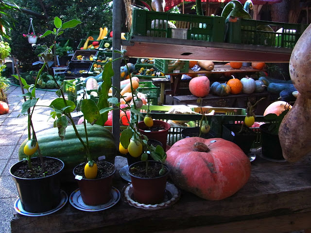 中庭はいろんな形のカボチャでいっぱい。手前のタマゴみたいなのは 茄子なんですって。