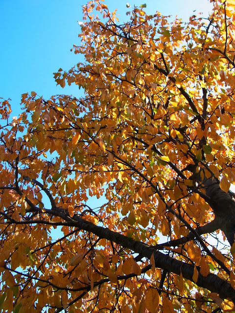 Cherry tree’s golden leaves are a bit pink.  さくら並木の葉っぱは 心なしかピンクが入っているみたい。