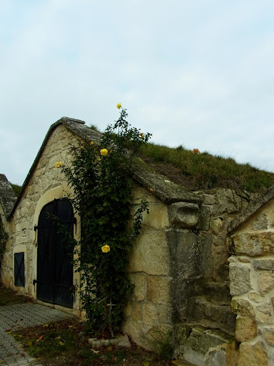 ワイン倉の並んでいる通りを、「バラの花の名残がきれいに咲いているなあ〜」と思いながら歩いていると・・・なぜか視線を感じる・・・。上のほうに どーんとかまえたネコさんが こっちを見ていました。