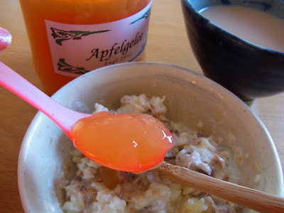 | おいしい手作りアップルゼリー♪ チロルの実家のお母さんが作ったのですって。ぷるんぷるん・・・すきとおってる♡ C’était le cadeau de Sigi !!! Extra délicieux, cette gelée… J’adore!!! |