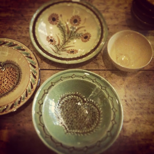 Annieの家の帰り、野菜や魚やチーズを売っているムフタール街のはじっこを横切り、地下鉄の駅のお皿の店にひっかかってしまいました。フランスの昔ながらの工芸品だそうです。かわいい! 控えめに、控えめに。2枚だけ小さなお皿を同じ茶色の地色でそろえて買いました。