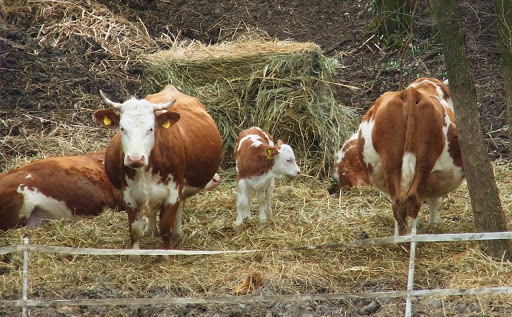 | かわいい赤ちゃん牛♪ 最初はうしろに隠れたけど、顔見せてくれました。 Le bébé était bien entourés de grosses vaches… |