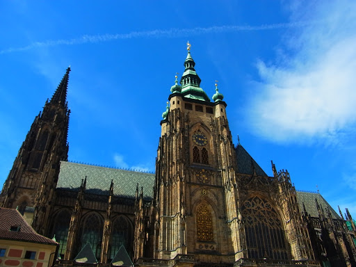 丘の上のプラハ城の敷地のなかにそびえる、ゴシック様式の聖ヴィート大聖堂。