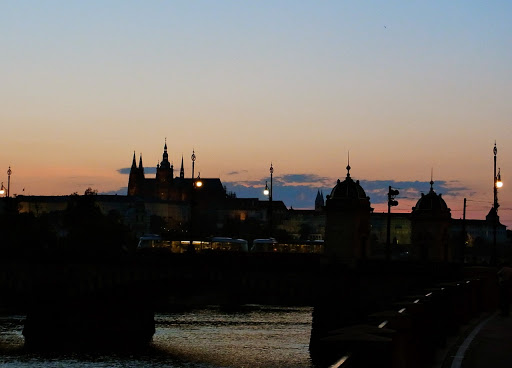 ビールと美味しい夕飯のあと、ご機嫌で路面電車を乗り換えて帰る途中、モルダウ(ヴルタヴァ)川の川岸から眺めた夕景。カレル橋のひとつ上の橋を路面電車が通っていくところ。丘の上にプラハ城のシルエット。