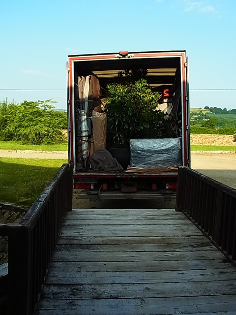 Ça y est, tous nos cartons, meubles et plantes sont arrivés hier et aujourd’hui dimanche nous sommes venus manger dans notre pub du village. En fait les gars ont appelé hier matin un peu avant 8h, Bernie est allés les chercher… et on a tout de suite commencé à décharger, il fallait leur dire dans quelle pièce mettre quoi … J’avais envie de dire ‘Mais je ne sais pas, moi!!!’ (On essaie, noooon ça marche pas, sorry guys, on change…) c’était un peu compliqué, mais les deux garçons étaient vraiment très gentils, assez pros, ils ont transporté ces grosses plantes à deux – incroyable! … et voilà!! On est surtout très contents de savoir qu’on peut maintenant relaxer un peu et ranger petit à petit. Pour le moment, c’était comme si on campait dans la montagne de cartons. Nous avons tout à découvrir, la connection internet à installer… Le plan de cet après-midi? SIESTE!!!