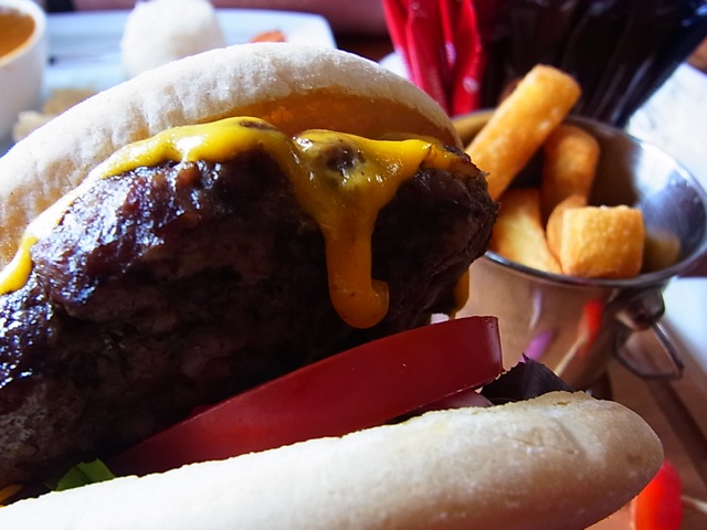 So far we had 2 days really sunshiny (‘if it continues like that, we will get water pb…’ speech) and I’ve seen a very fat, very green pheasant bird walking down on our balcony first thing in the morning, we’ve seen pleinty rabits and one young Bambi on the road (didn’t manage to photograph him, not quick enough!) seen sunrise, sundown, tried this ‘beef berger’. Tastes really good! (We were starving…)