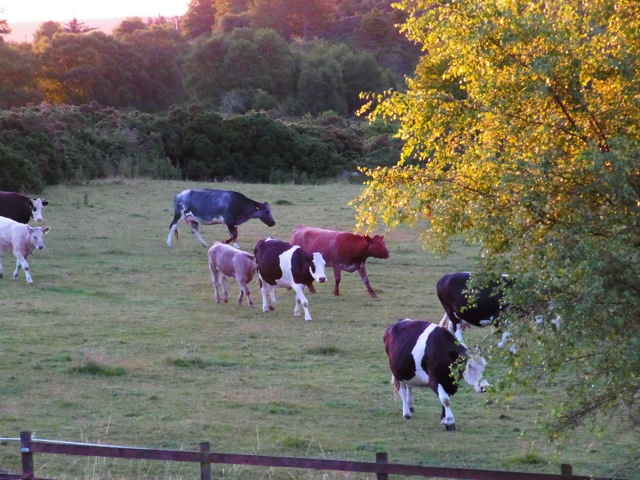 Mardi matin, un peu avant 6 h. Je me suis réveillée à la belle lumière de l’aube, j’ai pris des photos du ciel et de nos chères vaches qui arrivaient sur leur terrain… ensuite j’étais en train de prendre mon thé comme d’habitude dans la cuisine… quand je vois un gros truc rond, perché sur la barre au milieu, dans ces barrières qui délimitent notre jardin du terrain des vaches.