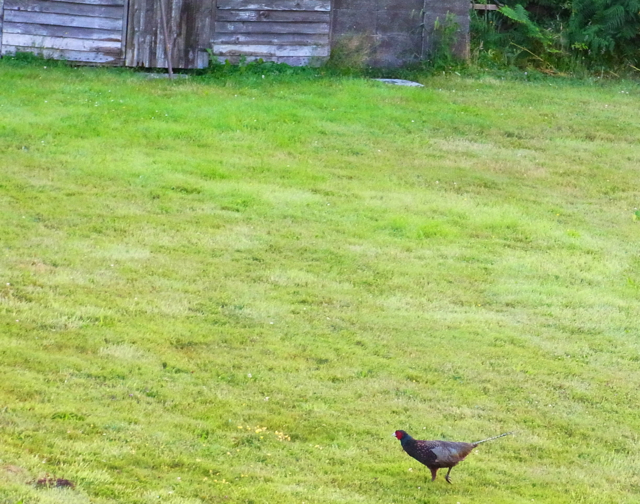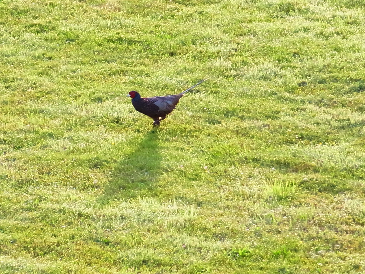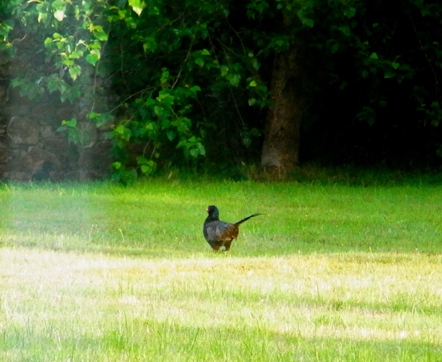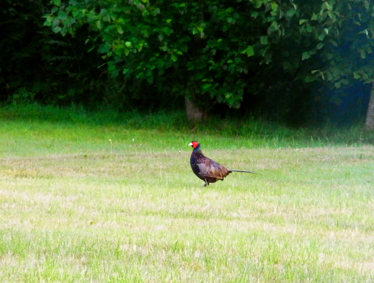 ‘Mais qu’est-ce que ça peut être, ce truc?… Tiens!!! Ça pourrait être un faisan!!’ (comme j’entendais, comme tous les matins, des cris caractéristiques de cet oiseau.) Vite!!! l’appareil photo!!! Je suis montée dans la chambre et quand j’ai regardé par la fenêtre, il était déjà au milieu du jardin, en train de le traverser tranquillement.