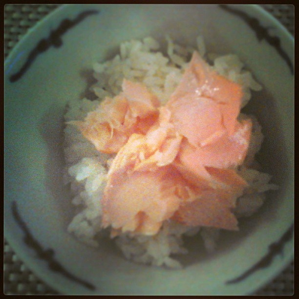 「塩ジャケのおにぎり、美味しいよ? だまされたと思って、食べてみれば?」なんて、誘いをかけても、ぜんぜんびくともしないのよね・・・ だいいち、海苔とか海草類がダメだしね、ご飯の冷たいのも美味しくないと思ってるしね。それ以前に「骨のある魚は苦手だ」とか言ってるしね。(骨あって あたりまえじゃんね、魚なんだから!!!)