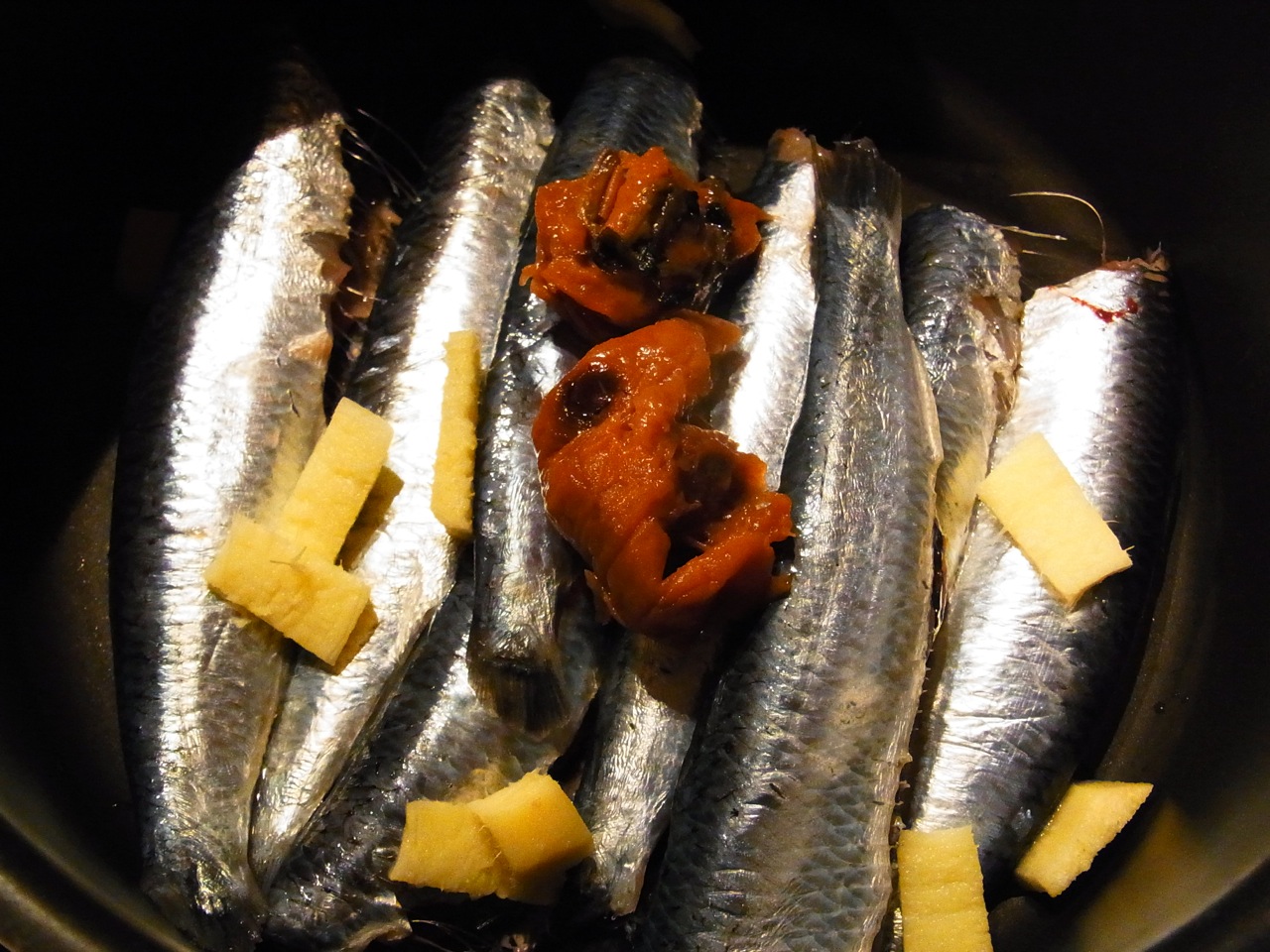 Sardines cuites à la japonaise avec de la sauce de soja, sake, vinaigre du riz, gingimbre et umeboshi (prunes salées confites, qu’on met généralement dans des boulettes de riz…) この銀色にきらきら光る新鮮なイワシちゃんを、酢煮にしたら 美味しかった!!