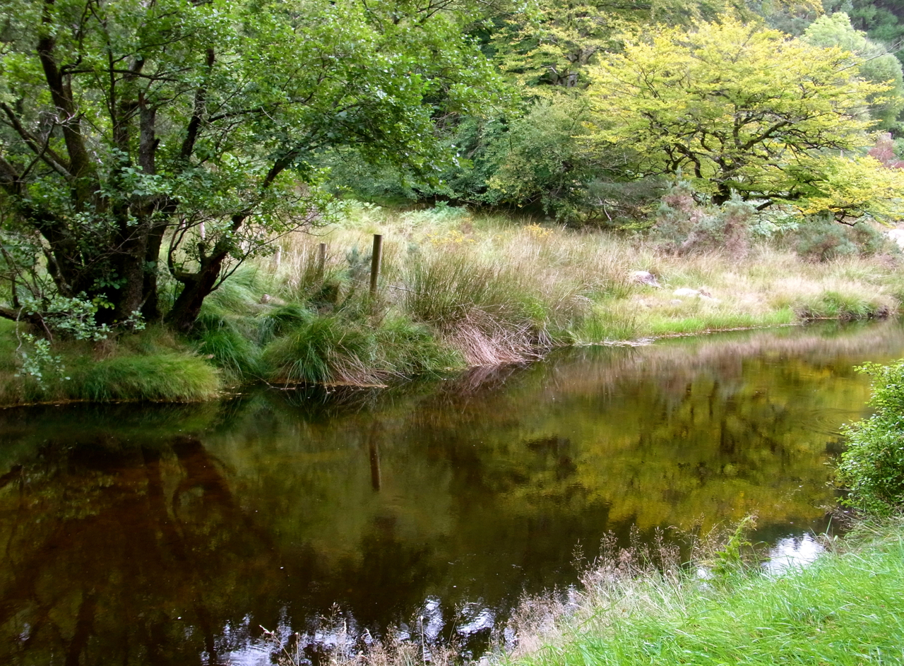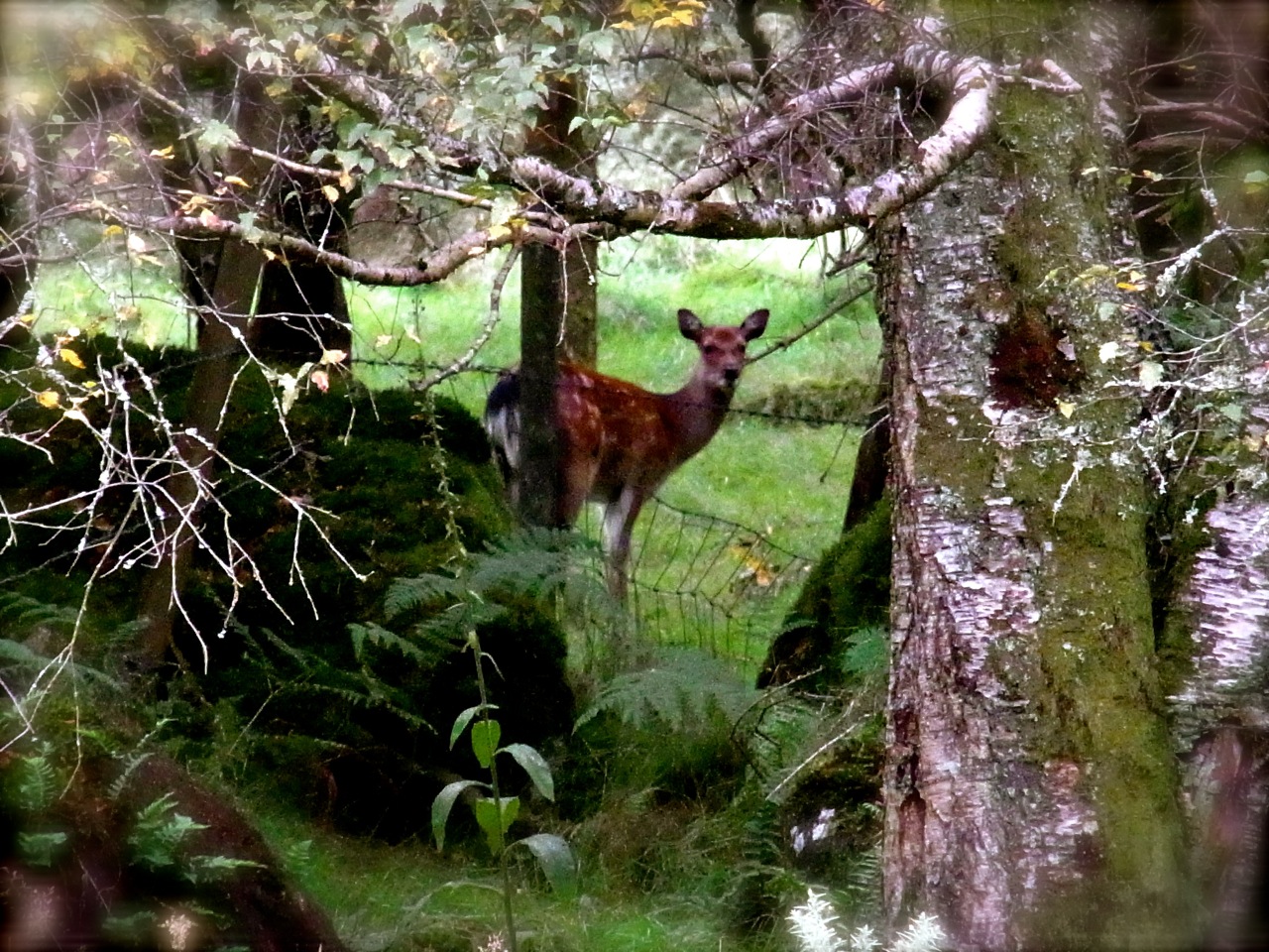 On longe le lac, on parcourt le chemin qui traverse le bois de pins. La lumière est très belle, sur la surface du lac. Elles nous montrent d’autres possibilités – d’autres routes qu’on fera un jour ensemble, en haut … mais pour le moment, elles disent ‘Tiens on va te montrer ce petit chemin qui monte et qui descend de l’autre côté… Salut Pam, à tout de suite, de l’autre côté!’ Et vlan!! On a pris ce petit chemin très étroit, un peu galère… mais à la fin on a rejoint une petite rivière qui s’appelle Glendasan, un chemin paisible par derrière… et on a rencontré des biches!!