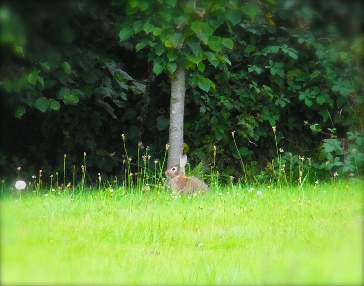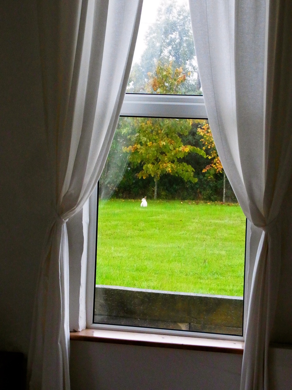 Bernie me dit qu’il y a un lapin en visite dans le jardin, que je n’avais même pas remarqué… Vite! la caméra!! Et voilà, il n’est pas baeau, tout blanc sur le tapis vert? 🙂