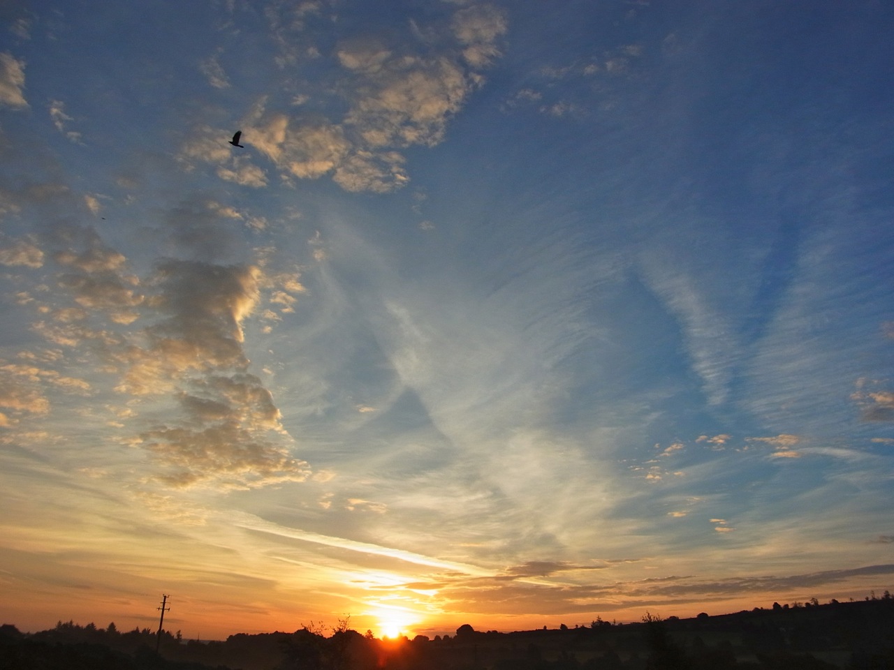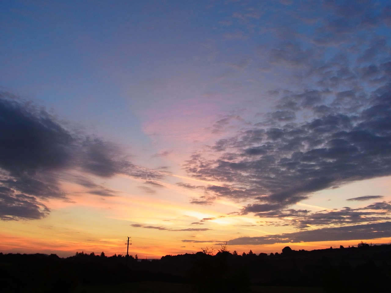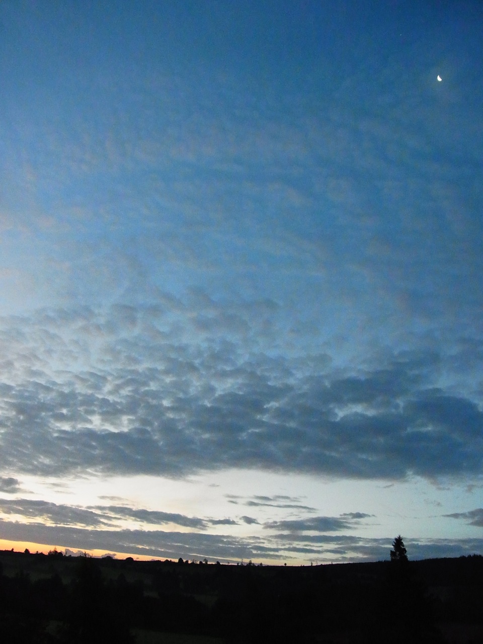 Samedi le 28 septembre. Je me suis réveillée archi tôt, il faisait encore complètement noir au départ… et au bout de quelques heures, il commence à faire jour. C’est ainsi que j’assiste à ce spectacle grandiose du soleil levant. J’adore ce petit moment – juste 10, 15 minutes -que je passe perchée à la fenêtre de la chambre du haut, toujours la même, par laquelle j’ai une super vue sur l’horizon de mon coin à Moneystown. A Breitenbrunn, j’avais la porte-fenêtre qui donnait sur le balcon et maintenant c’est cette petite fenêtre. Une fois de plus, un ami professeur d’histoire de l’art Monsieur Ide me dit que le ciel de chez nous ressemble à un tableau de Turner. (Il avait indiqué Millet une autre fois!) Oui, il a raison de dire que c’est quelque chose de magique d’habiter sous un ciel qui nous montre tant de couleurs variées, claires et simplement splendides.
