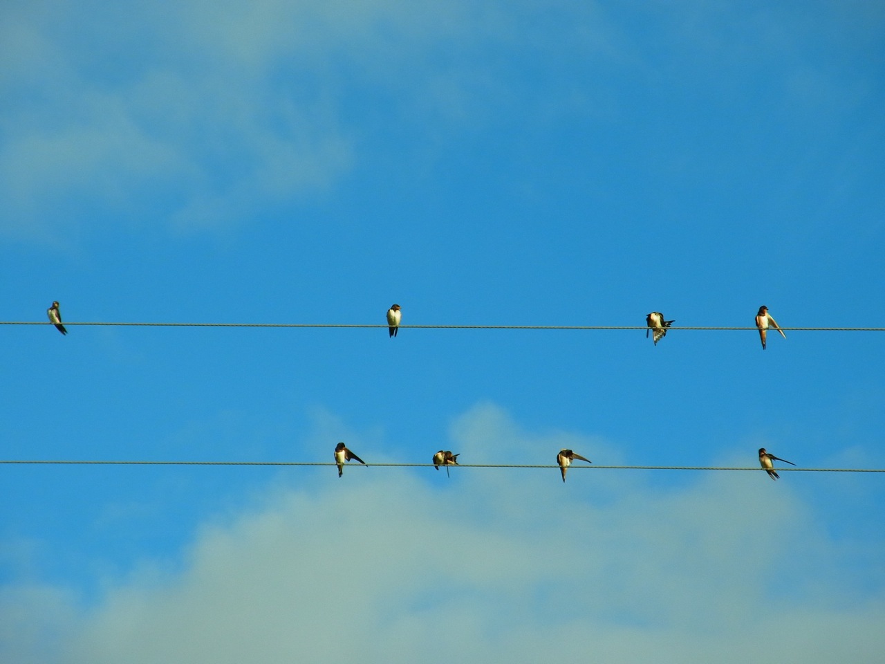 こんなふうに晴れ上がった空を背景に、音符みたいに電線にとまって「ひとやすみ」のツバメさんたち。これから、また無事でアフリカまで飛んで行ってね♪