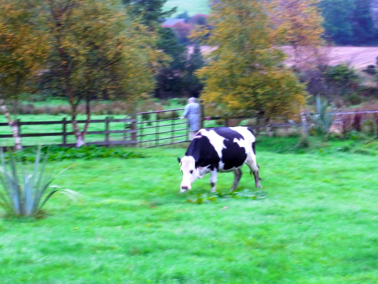Bernie n’était même pas encore habillé… le pauvre!! On a ‘guidé’ les deux vaches vers leur terrain… mais le soir elles sont revenues!! 朝いちで来ちゃった牛さん。バーニー起き抜けだったのに、「牛追い」しなくちゃいけなくて、たいへんでした笑
