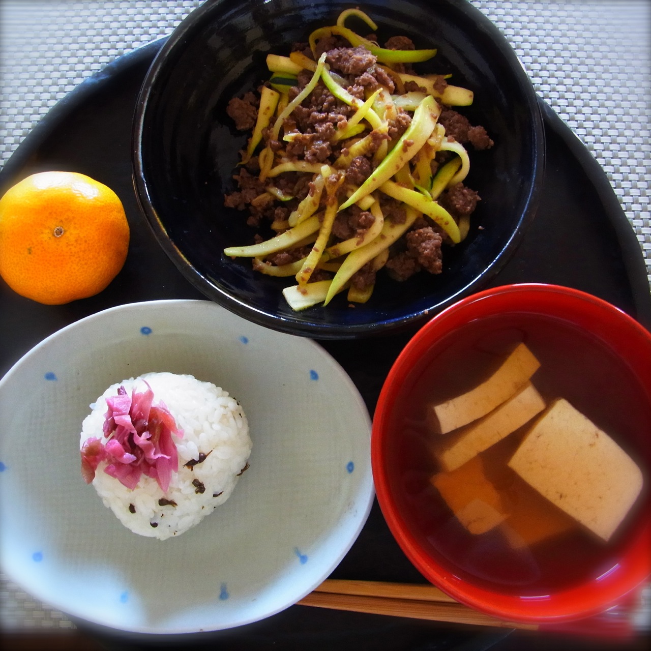 ズッ キーニと牛肉そぼろ炒め 生姜味、遠野の紫蘇の実の塩漬けを混ぜたおにぎりに、やっぱり遠野の茗荷のウメ酢漬け、豆腐のおすまし。Un déjeuner japonais, mardi à midi, avant de repartir à l’hopital. Important de bien manger!