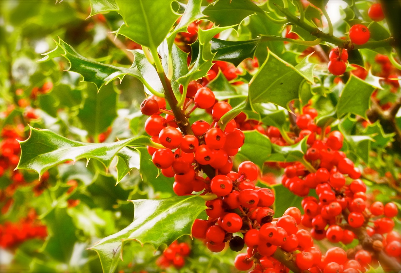 3メートルぐらいある、大きな柊の木。葉っぱがぴかぴか 赤い実がきらきら。鮮やかです。