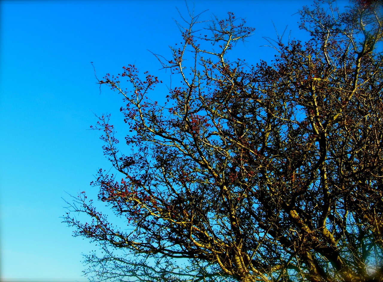 真っ青な空に伸びた枝、冬の樹を飾る 赤い実が、きらきら丸くて美しい。