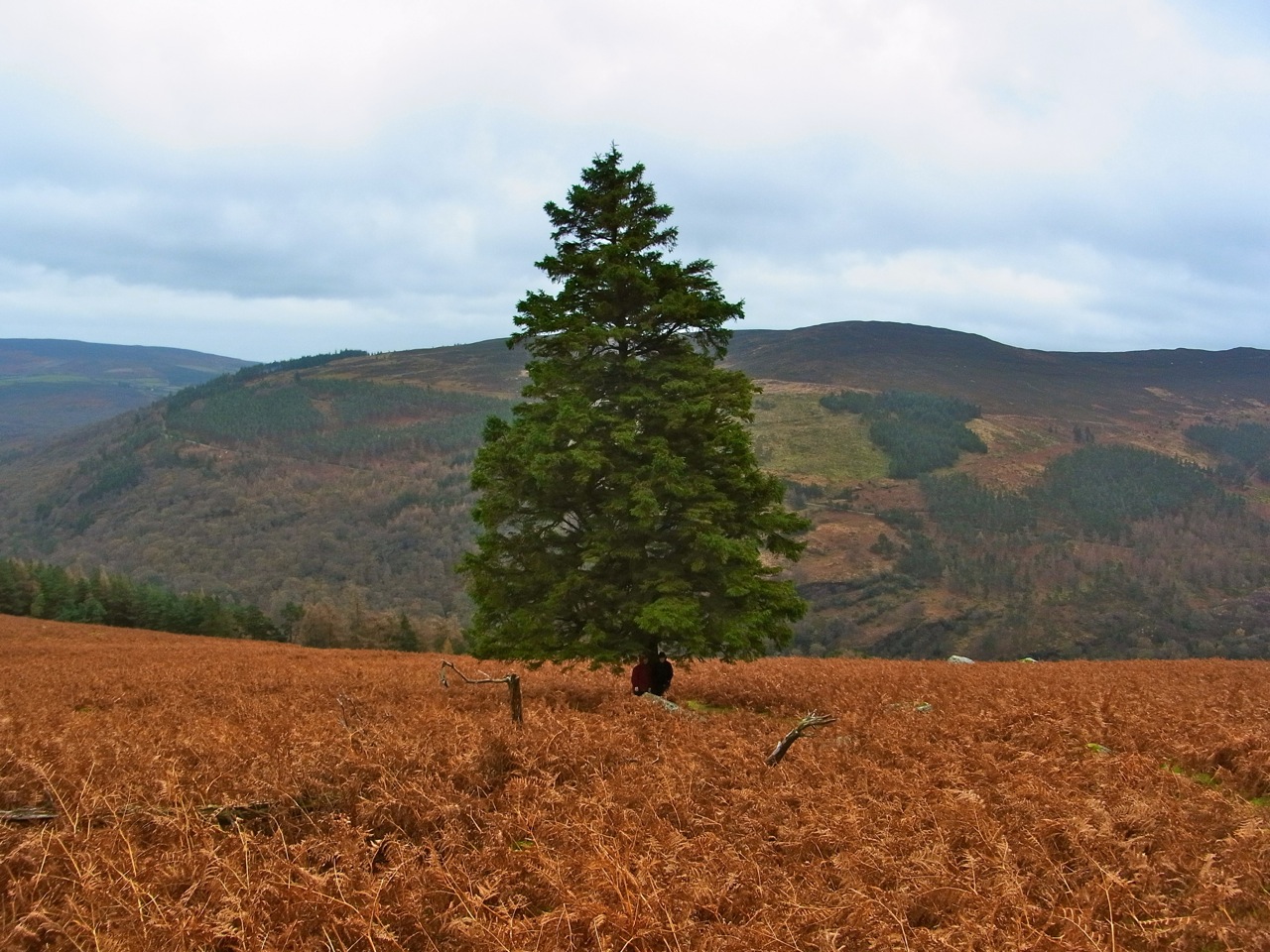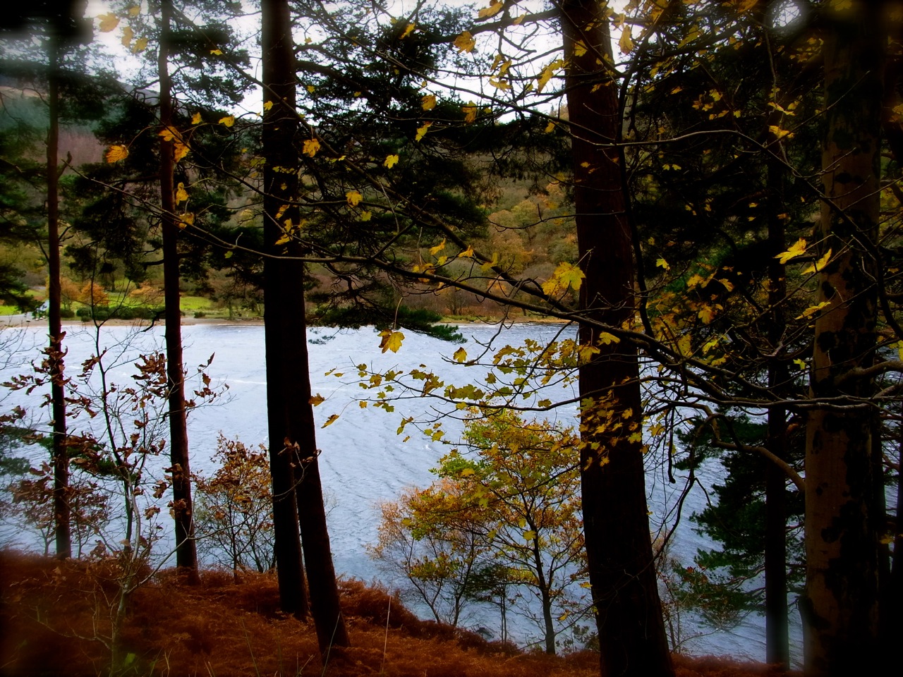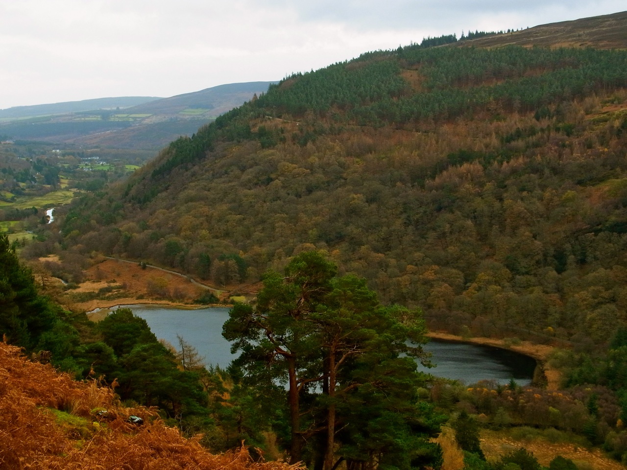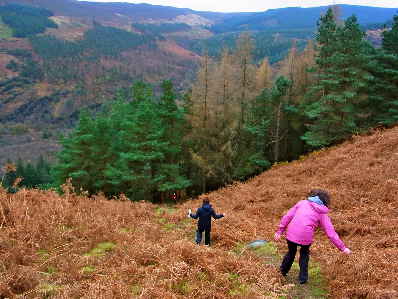 11月29日(金)グレンダロッホ。この日は、朝ちょっと小雨まじり、強い風が吹いていたので、「いつもと違うコースにしましょうよ」という相談になって、いちばん歩く道に詳しいアンのあとにくっついて、4人で歩き始めました。いつものコースとは谷をはさんで反対側のエリアです。前に一度行ったことのある、(鹿を見たところです)裏側の谷 グレンダサンの川沿いに歩いて、そこから山の上に登って行きます。前のときは、湖のほうから上がって、裏のグレンダサンのほうへ降りたのだけど、今回は逆方向。つまり、裏のほうから山の上へ登って、今度は谷側の底まで一気に下り坂になるわけ。行きも帰りも急な坂で、かなり すごいコースです。