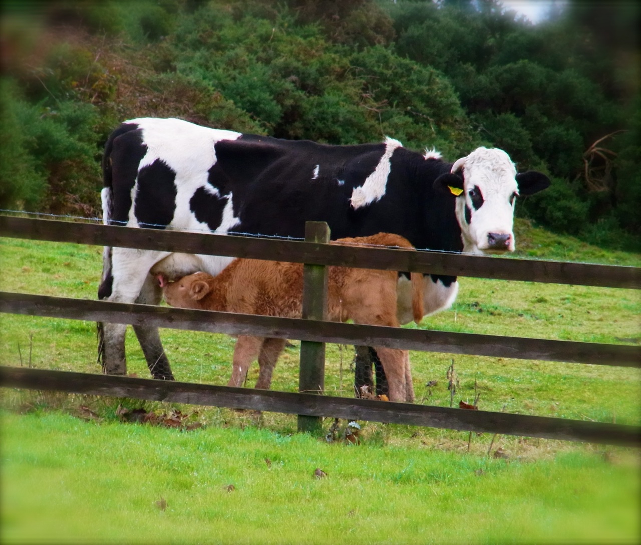「やっぱりお母さんがいいや〜♪ ごくごく。。。」 (お母さん牛、カメラ目線♪)