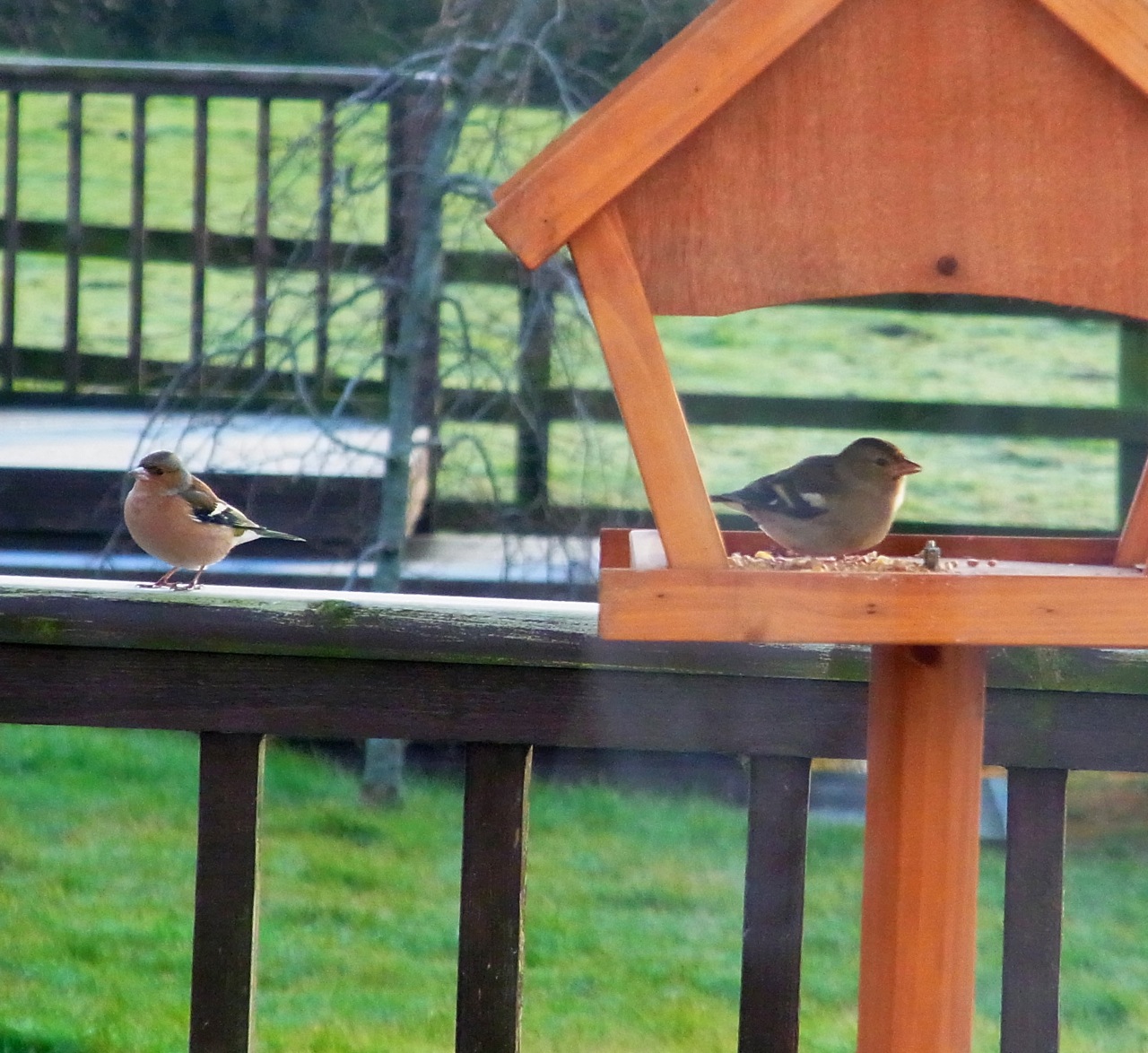 Ces quelques derniers jours, il fait assez mauvais, soit extrêmement venteux ou pluvieux et pas tellement de soleil. Mais dès que c’est un peu plus calme… il y a plein d’oiseaux qui viennent chercher à manger. L’autre jour, dans la matinée, ils sont tous sortis d’un seul coup et c’était un peu comme un petit ’embouteillage’ autour du mangeoir.