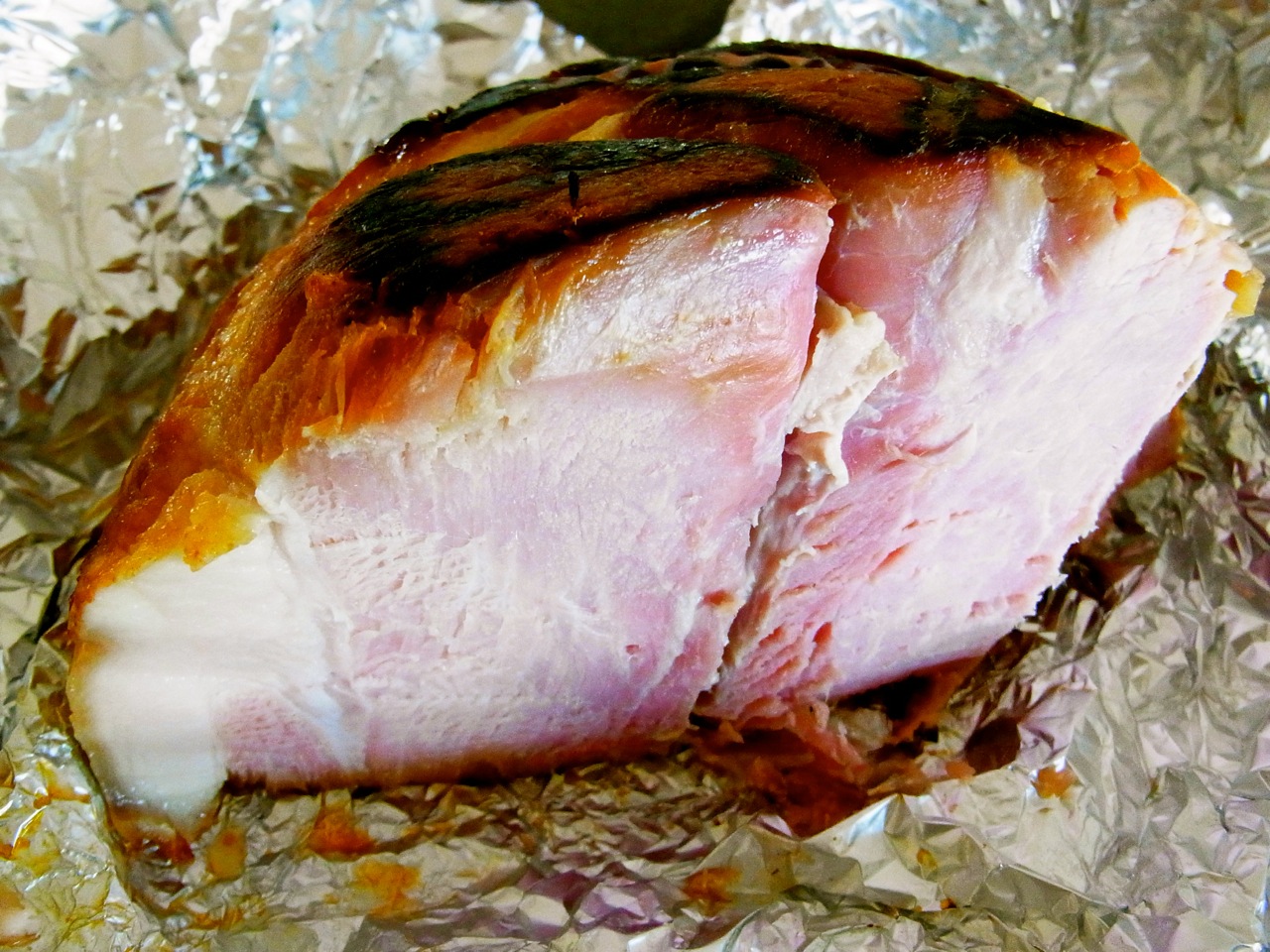 ハムっていうと、sachanの頭に浮かぶイメージは、日本でサンドイッチにはさんで食べる薄切りのスライス。それからメロンといっしょに食べる、フランスやイタリアやスペインの生ハム。・・・「ハムを焼く」って、どうするのかな?と、ちょっと疑問だったのです。散歩の友だちにたずねたら、「塩がきついから、まずたっぷりのお湯で茹でて、お湯を捨てて、また入れて続けて茹でて、2回ぐらい捨てるのよ、そして最後にオーブンで焼く。そのときにマーマレードとかハチミツとかの甘いものを上の脂身のところに塗って焼くと、香ばしくかりっと焼けて美味しいわよ〜♪」と目を輝かせながら教えてくれました。・・・ むむむ、美味しそうですね、試してみようかな?