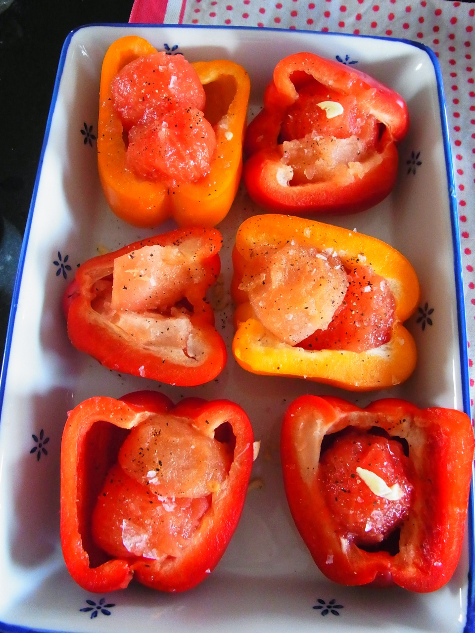 ピーマンふたつに切って、トマト(小さめ)湯剥きにして中につめて(ニンニクの薄切りも入れて)、上から塩コショウとオリーブ油たらーりとして、オーブンに入れて焼くだけです。