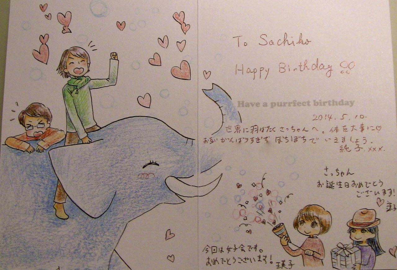 Achan a dessiné ma carte d’anniversaire!! Avec un gros éléphant et moi dans mon habituel vert -irlandais!! 今年もあーちゃんのイラストのカードです♡ 大きなぞうさん いつもの散歩の格好で緑のジャケットのさっちゃん。じゅんじゅんがずり落ちそうだあ〜!! :) 楽しいカードありがとさんね。