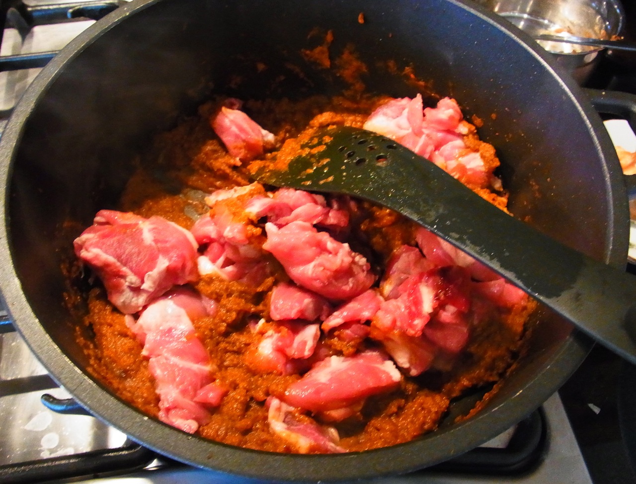 9) ラム肉の角切りをこのなかに入れ、肉にマサラをよくからめるようにして、肉の外側に火が通るまで炒め続ける。