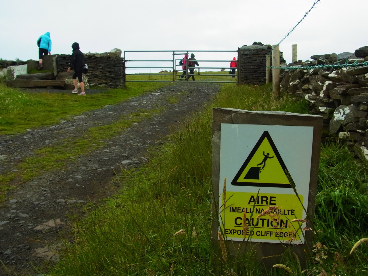 モハーの断崖を端からたどる道の手前のところまで、車で20分ぐらい。民家の庭が駐車場になってるところに車をおいて、雨支度で歩きはじめました。