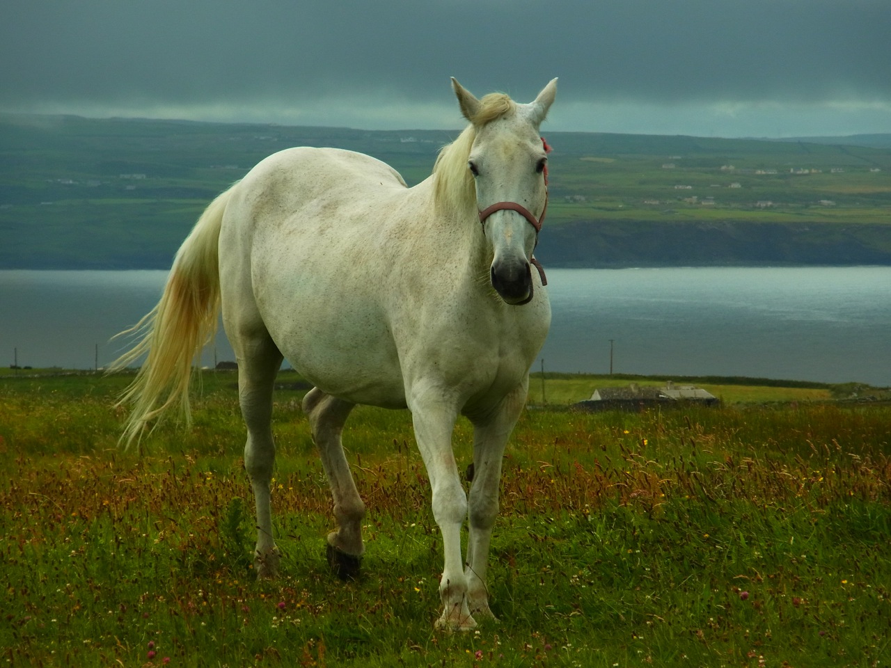 霧と雲に包まれて灰色のような、青い海・・・ あんな突端の先っぽの牧草地で草を食べてたお馬さん。