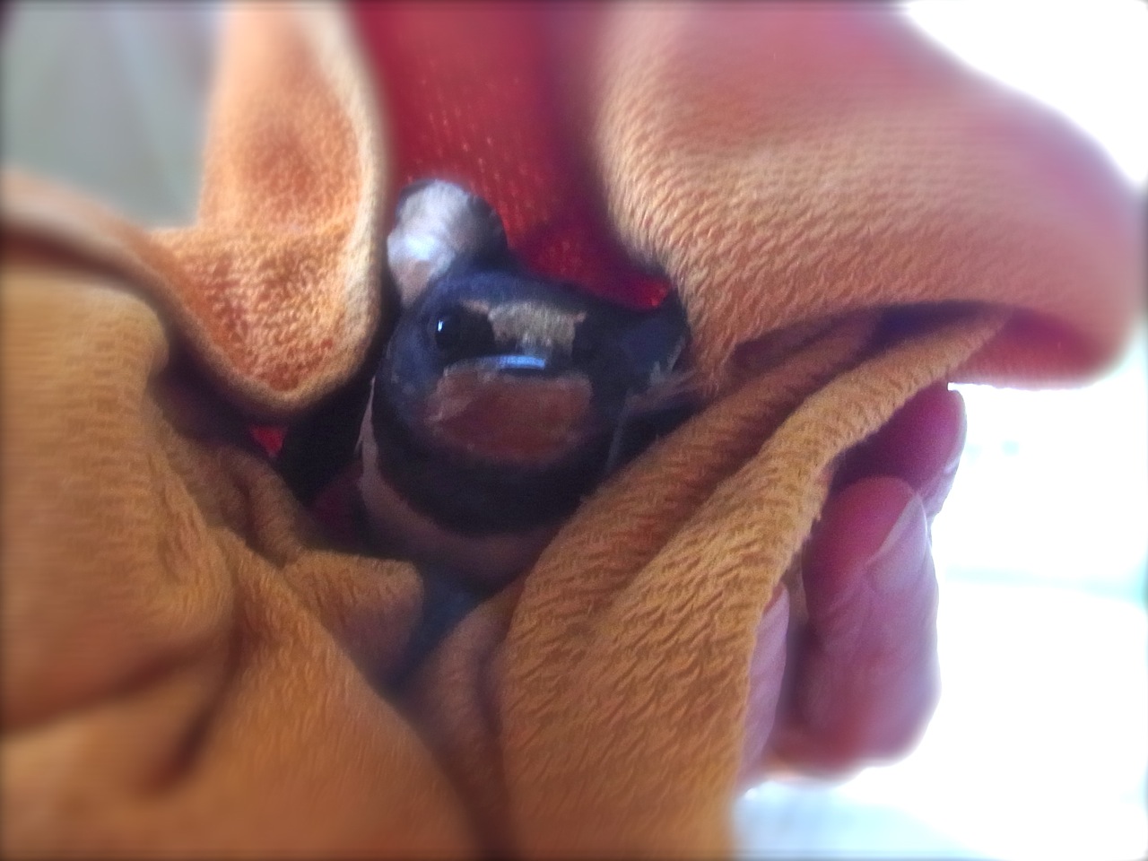 Attention à pas le blesser… Bernie a l’habitude de l’attraper, très délicatement avec une serviette de cuisine.