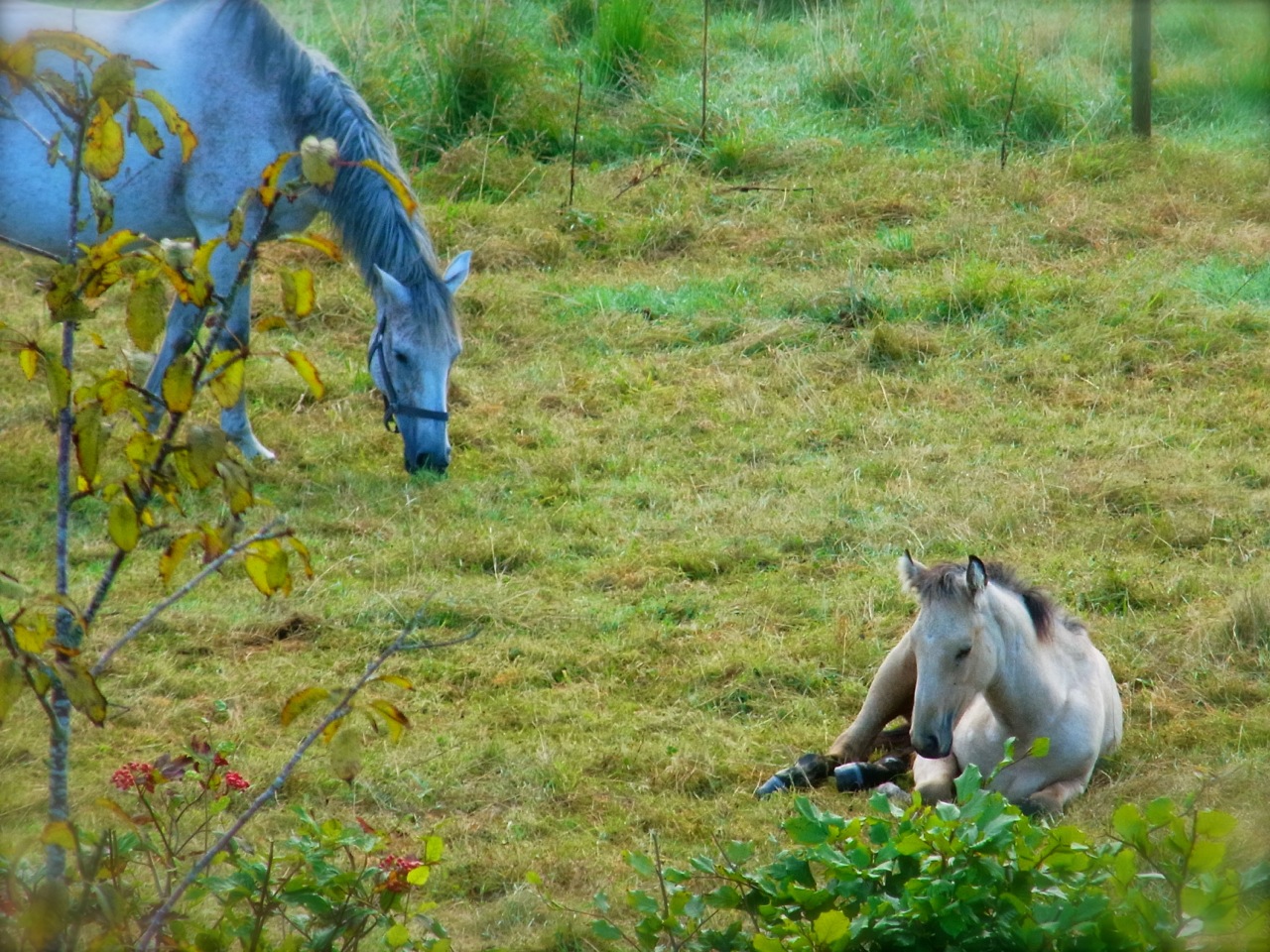 昼寝ちゅうの仔馬さん。お母さんは ちゃんとそばに立って様子を見てるみたいです。 Le bébé fait la sieste et dans ce cas-là la maman est à côté à le garder.