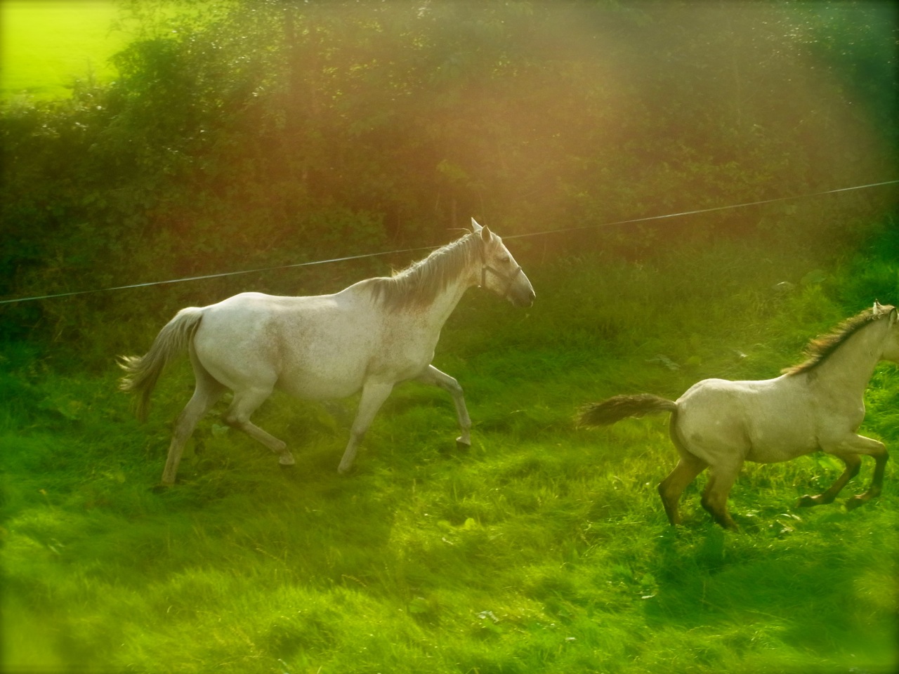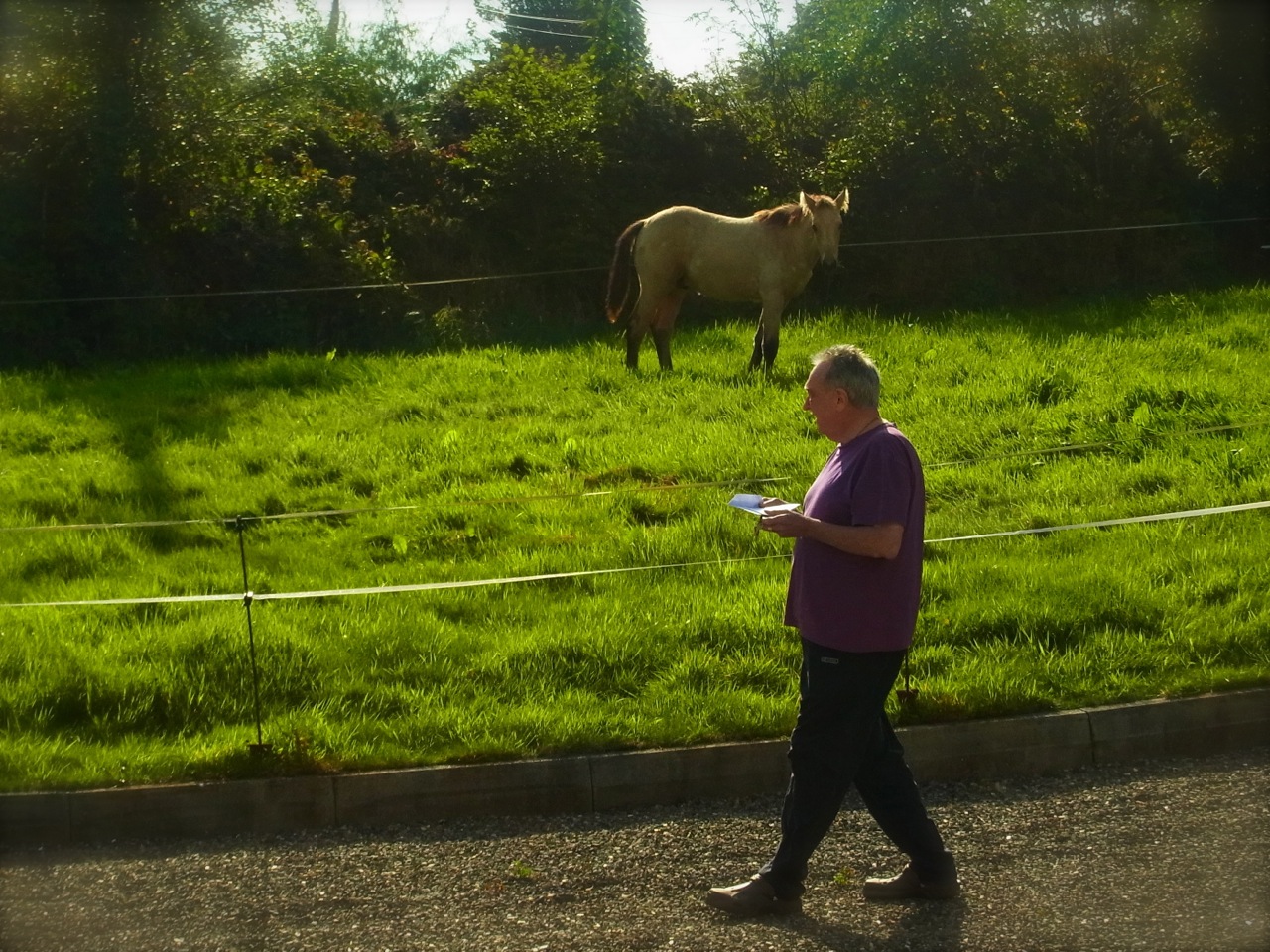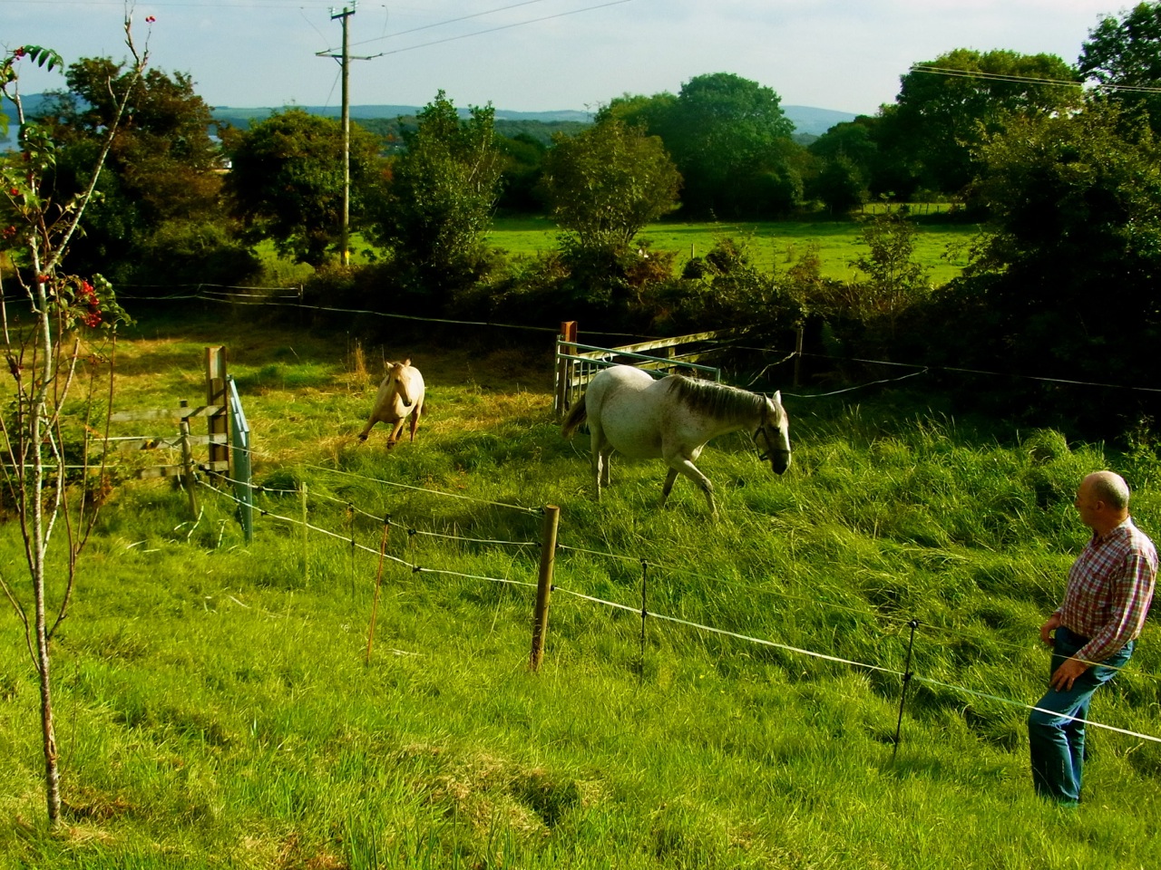 Au départ ils avaient juste un espace limité près de la maison et ensuite Joe notre propriétaire a ouvert leur ‘domaine’ jusqu’en bas du terrain – ils pouvaient ainsi courir et tout manger… mais ensuite on a eu un petit ‘pépin’ : le bébé-cheval est parti rencontrer les voisins!