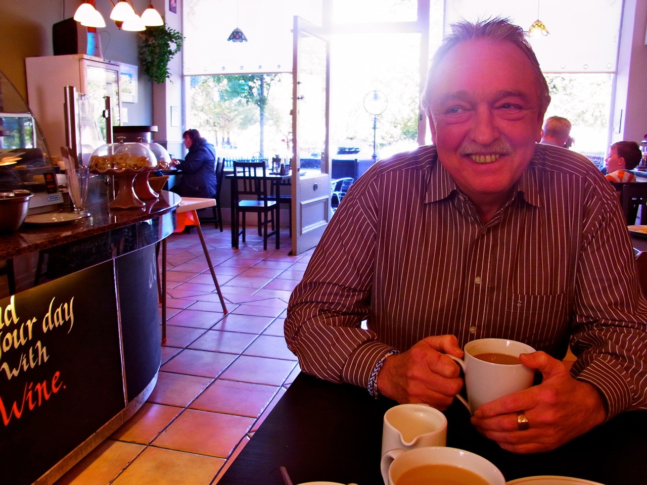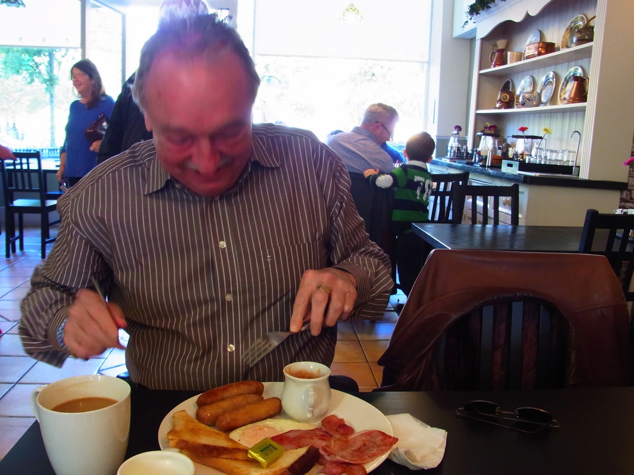 10月4日 土曜日は出発からビックリ! 車で家を出て走り始めたと思ったら、急停車・・・ 「えっ?どうしてストップしちゃったの??」 「だって、ホラ。」 真っ正面、道いっぱいに広がって通行してるのは、羊めーめーの団体さんでした。 うぎゃぎゃ〜タイヘン!! じっと 通り過ぎるのを待ってから、そーっと発進。 そして、警察署の用事がすんでから、ブレイの街のカフェでお茶で一休み・・・ バーニーちゃんは「フル・アイリッシュ・ブレックファースト(アイルランド式朝ご飯一式)をたのんでるぞう。 ・・・もうお昼過ぎてるから「ブランチ」だね。手続きが済んで、ほっとしたらお腹がすいたのかな。 うれしさいっぱいの顔で平らげてました。 よかったね。