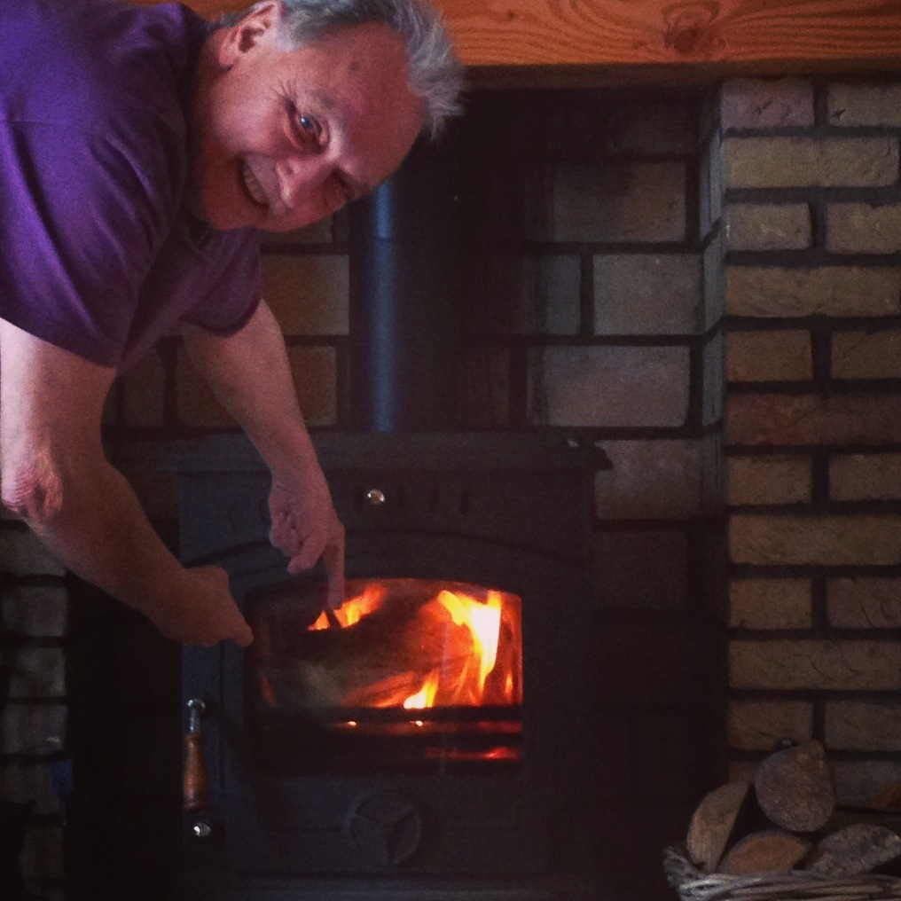 Bernie a maintenant bien acquis la technique de brûler le bois dur dans la poêle – car il y a du ‘bois dur’ et ‘moins dur’ qui brûlent différemment- et il est en train de devenir ‘maître-artisan spécialiste de chauffage à bois’ ici dans la nouvelle maison. C’est qu’il passe les soirées entières installé devant la poêle et ça lui plaît énormément!