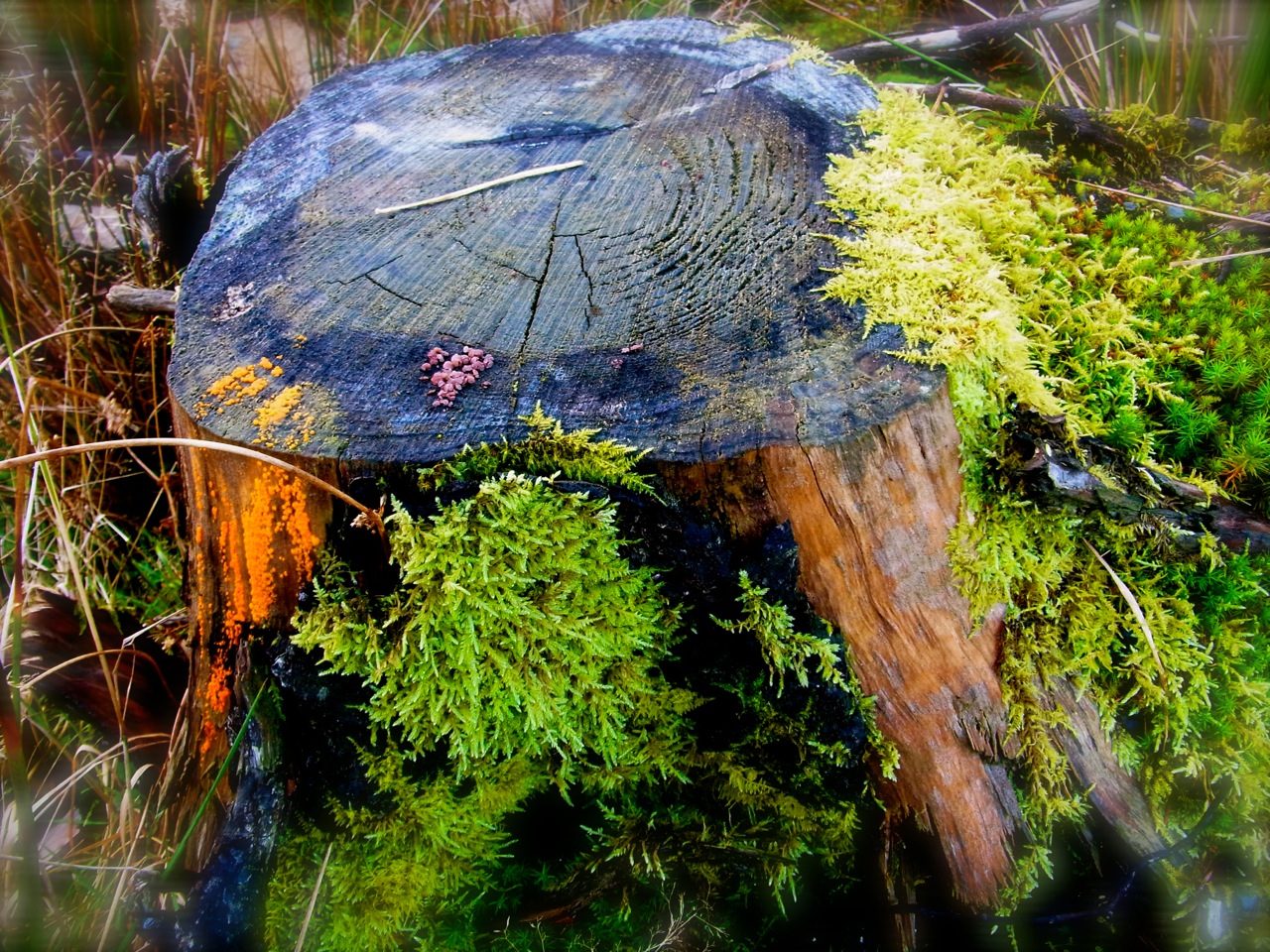 戻る途中の道ばたの切り株が「苔の見本」でしたよ。
