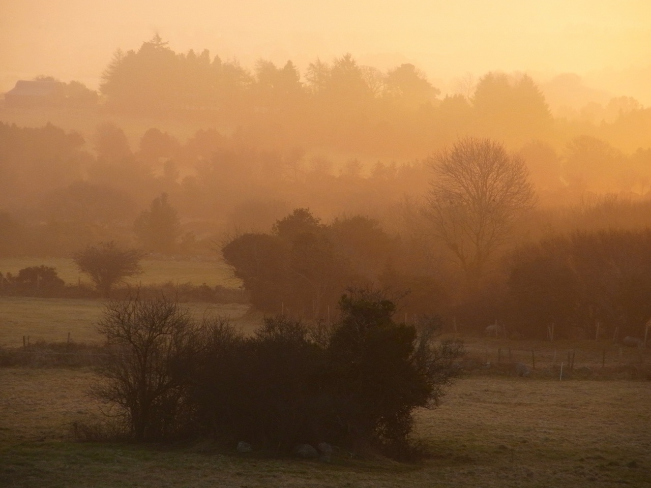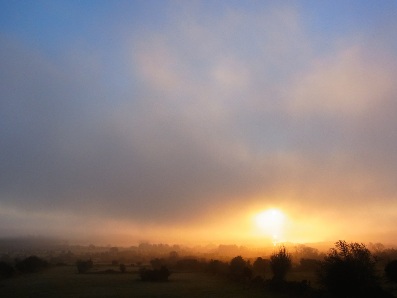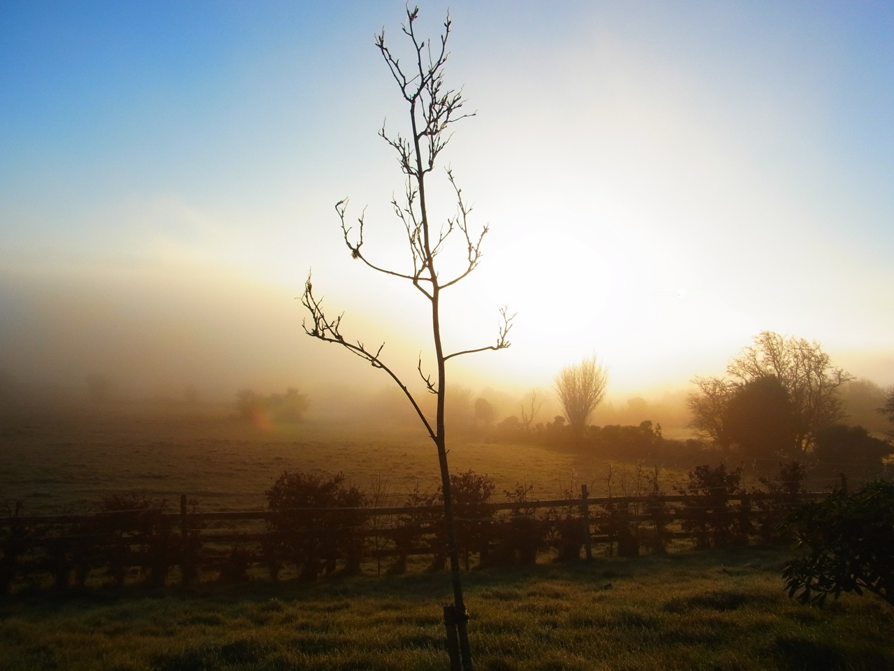霧の朝、全部真っ白で何も見えないなーと諦めて、しばらくすると、なんだか外がオレンジ色になっています。