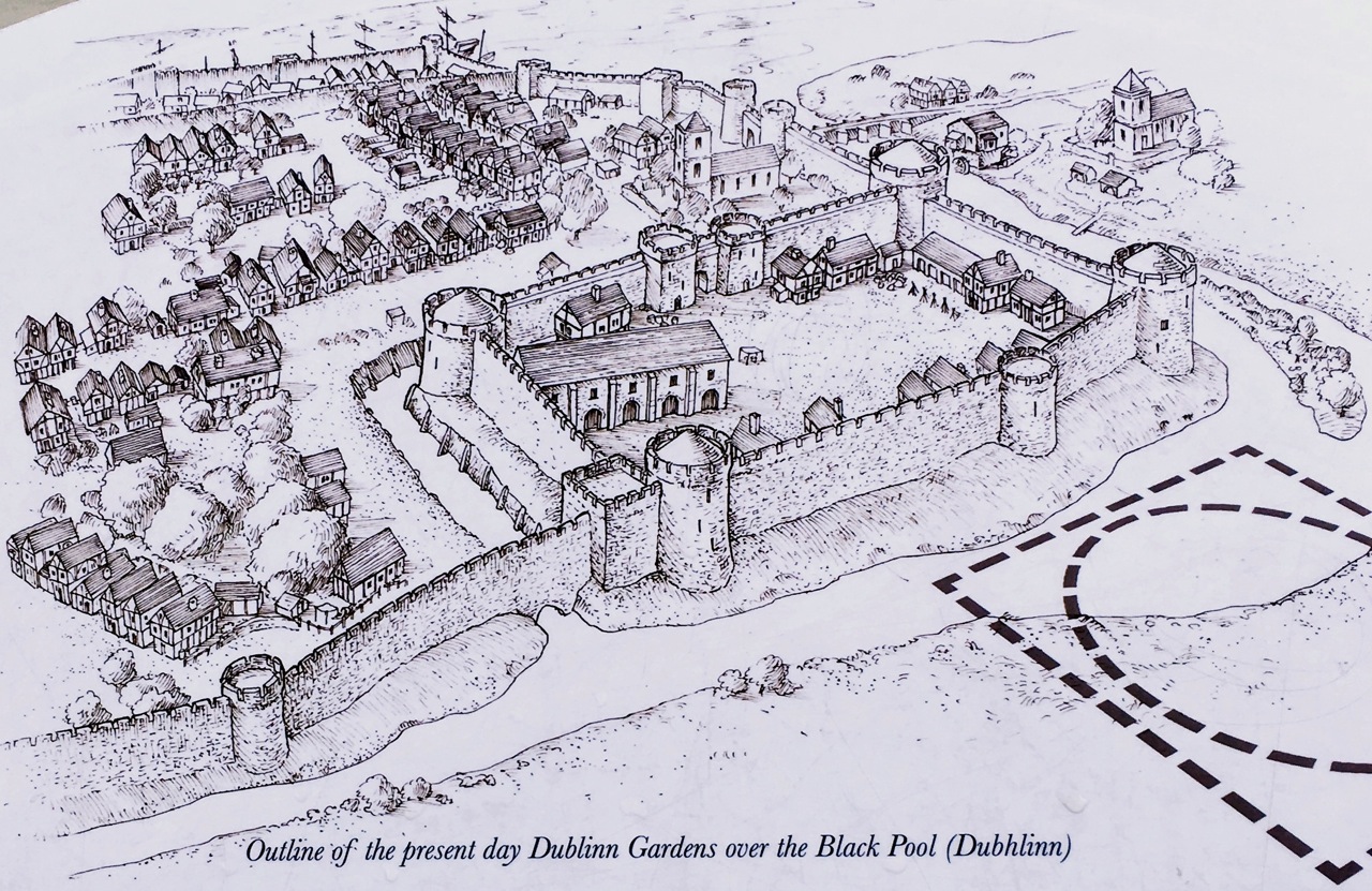 お城そのものの見学はまた別の機会に・・・石畳の広場の下を横切って、反対側の壁のところにあるゲートをくぐって入ると、その先がまた広い公園になっています。昔はここが「黒い水たまり」(Dubh Linn)だったところ。ダブリンという名前の起源になったところなのだそうです。
