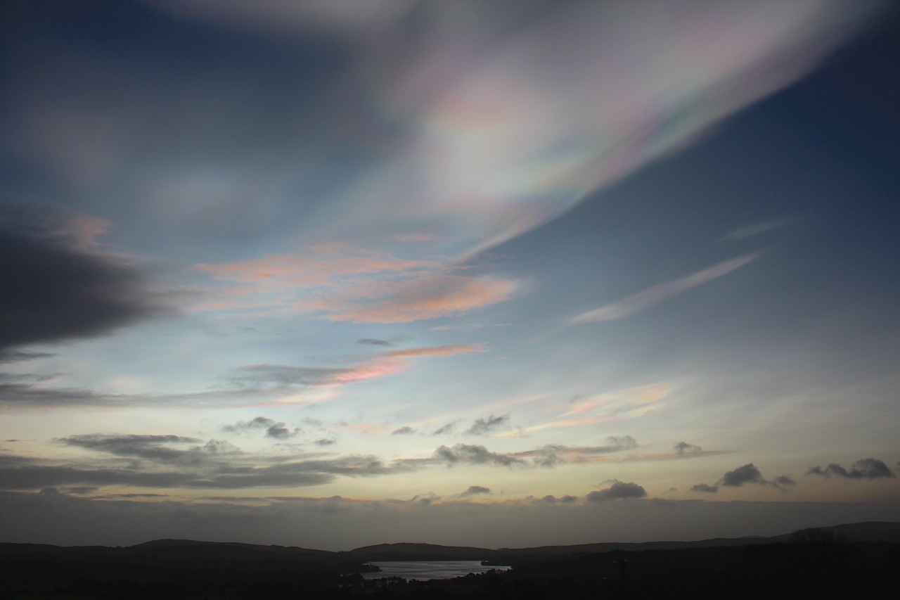 なにかなあ〜 オーロラみたいだね、でもオーロラは夜空だけに見えるはず・・・彩雲かな?・・・と話していたら、そのうちアイルランドの新聞にも取り上げられていました。「真珠母雲 (nacreous)」というものかなと思いますが・・・。