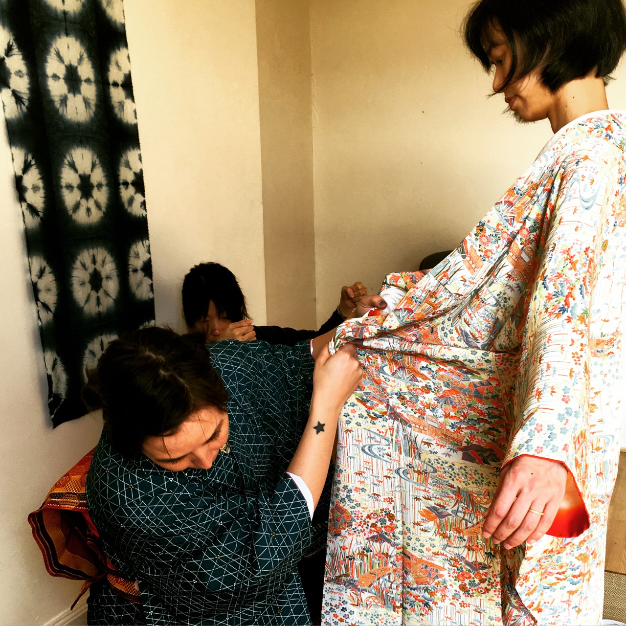 Emiko san a montré à Akiko san et Emily comment on habille une autre personne. (Parce qu’elles savent déjà très bien s’habiller elles-mêmes, bien sûr!)