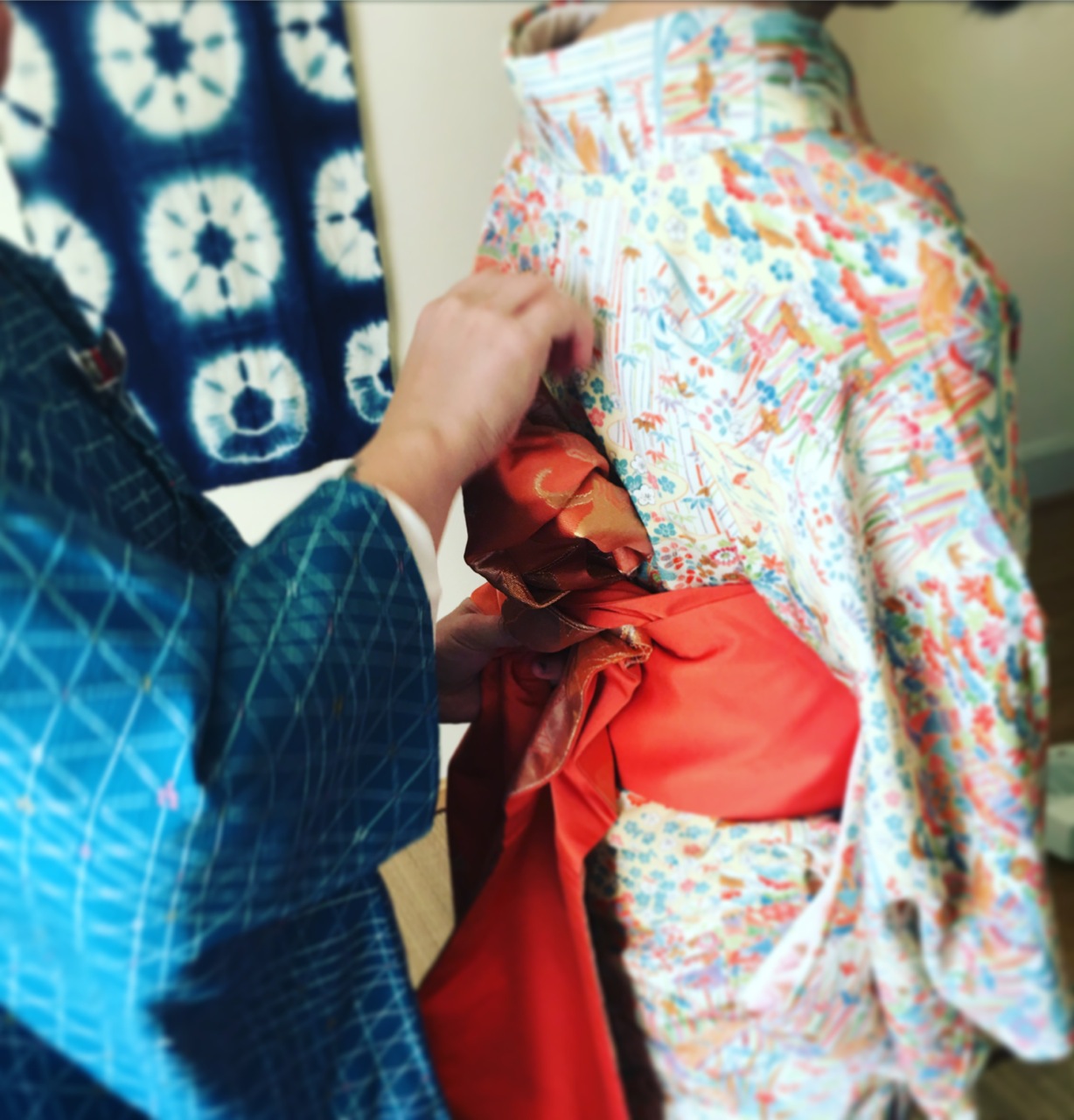 でも、紐を結ぶ位置とか、なかなか決まらない衿の合わせるところの感じとか、補正のタオルを入れるとどんな感じになるのかとか・・・
