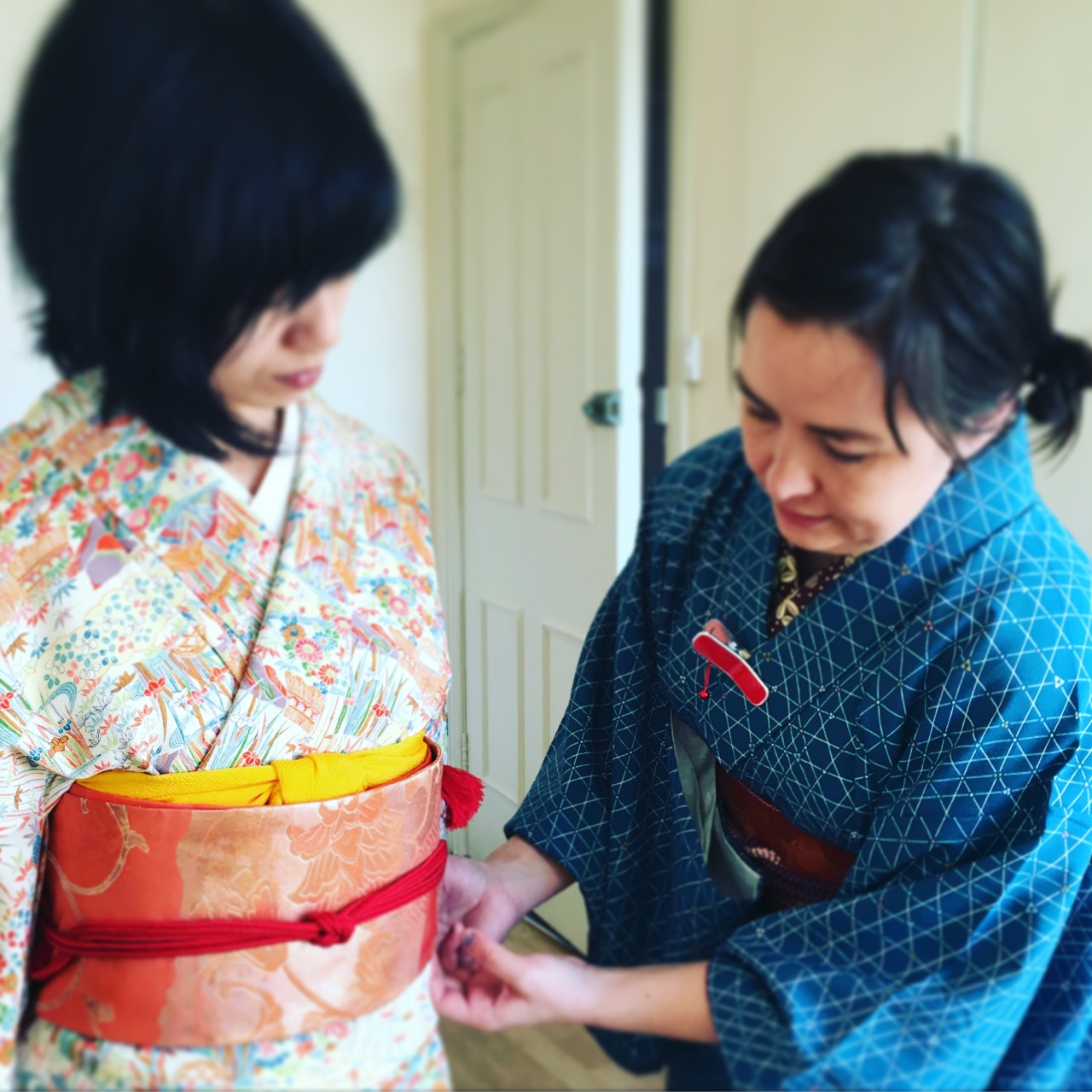 今回は「他装」の練習。sachanはお手伝いで、亜紀子さんに着物を着せてもらう役です。つまり、立ってるだけ!