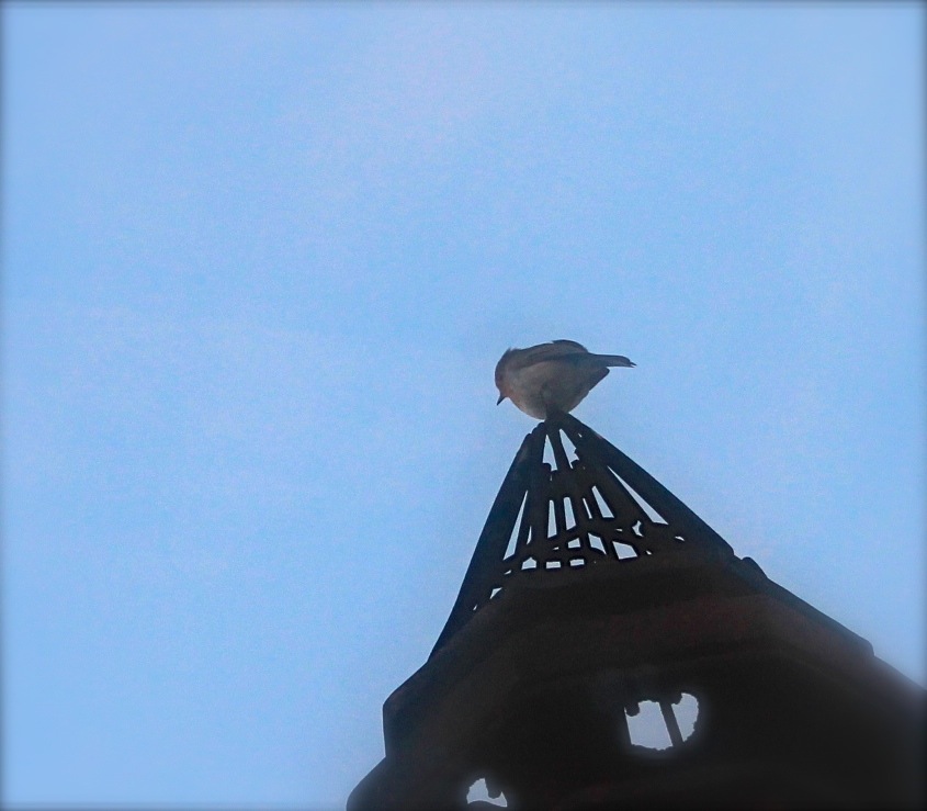 朝起き出して外を眺めて、それからコンピュータの前に座っていると、すごく近くで囀りが聴こえると思ったら・・・窓のすぐ横にある煙突のてっぺんにとまって歌っているのです。