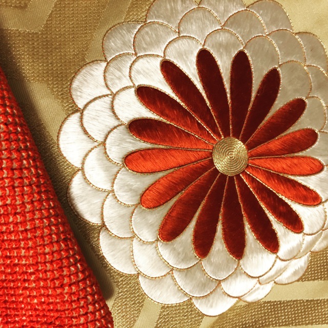 30年ぐらい実家の長持のなかで眠っていた、この着物が着られるようになって嬉しいけど、日本ではちょっと恥ずかしくて着られない派手さ。