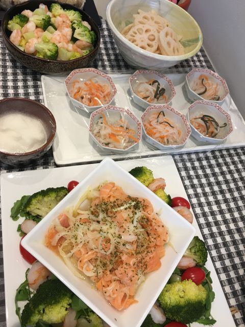 サーモンのマリネ、えびまき、マンゴーのサラダ、ベトナム春巻