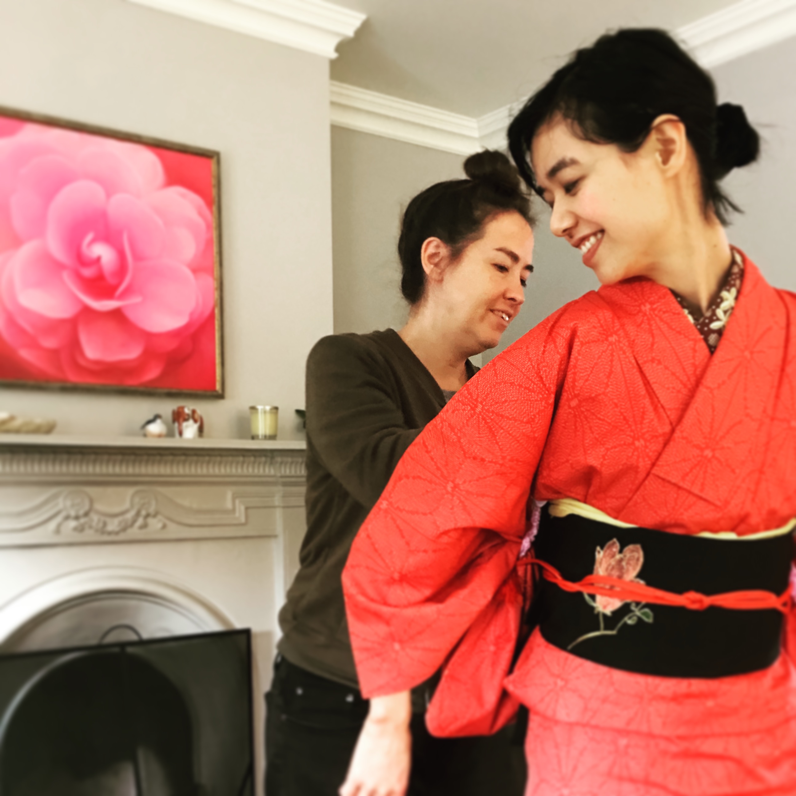 2月19日 Dublin Kimono teamのEmilyとAkikoさんがわざわざ来てくれて、いろいろ着物や帯を出して組み合わせを選びました。Aoiさんもお嬢ちゃんを連れて来てくれて「見学」。話がはずんで賑やかでした。
